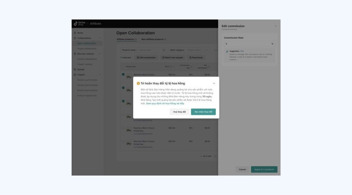 Bước 2: Nhấn nút “Edit commission” để chỉnh sửa tỷ lệ hoa hồng. Sau khi điều chỉnh xong, bạn nhấn “Xác nhận thay đổi” để lưu lại. Đây là thao tác quan trọng vì tỷ lệ hoa hồng sẽ quyết định mức độ hấp dẫn với nhà sáng tạo.